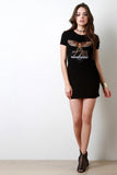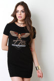 This shirt dress features a jersey knit fabrication, an eye-catching eagle patch with numbers 778 at front and at one sleeve, round neckline, and short sleeves fit. Finished with a mini-length. Accessories sold separately. 90% Cotton, 10% Spandex.