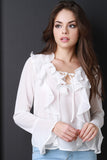 This lovely blouse features a lightweight chiffon fabrication with cascading ruffle detail at front and back. Also features a v-neckline with front-tie closure, long sleeve, and high low hem. Accessories sold separately. 100% Polyester.