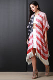 This patriotic poncho features gauze like woven fabrication, distressed american flag print, kimono style sleeve, open front, square cut and a fringe trim hem. Accessories sold separately. 100% Polyester