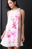 Watercolor Floral Print Ruffle Neckline Shift Dress