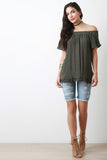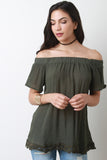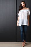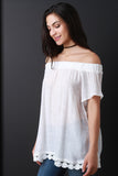 This bohemian inspired top features a lightweight woven fabrication, off the shoulder wide elastic neckline, short flare cut sleeves, flowing wide cut silhouette and a crochet medallion trim. Accessories sold separately. Made in U.S.A. 65% Polyester, 35% Rayon.