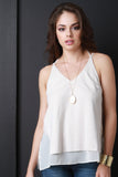 This sleeveless cami top features a seamless v-neckline, spaghetti halter and shoulder straps design, double layer construction with semi-sheer chiffon underlay, finish with high vent slits at sides. Accessories sold separately. 100% Polyester.
