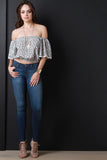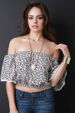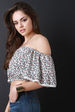 This crop top features floral print, off the shoulder elasticized neckline, wide short sleeves with crochet trim, and elasticized hem. Accessories sold separately. 100% Polyester.