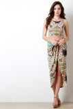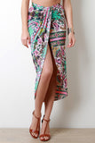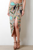This colorful skirt features a soft knit fabrication, tribal lotus print, draped faux wrap midi skirt over mini skirt, and hidden elasticized waistband. Accessories sold separately. Made in U.S.A. 92% Polyester, 8% Spandex.