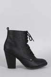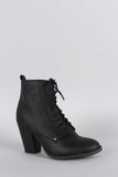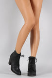 This combat style inspired bootie has a lace up tie closure and a side zipper for easy on-off wear. Features a stacked chunky heel. Finished with stitching detail.