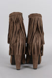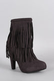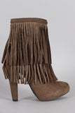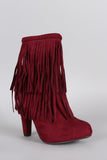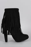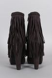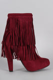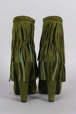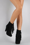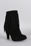 These boho-chic booties feature an almond toe silhouette, double layered fringe design, braided detail at collar, low hidden platform, and wrapped thick heel. Finished with cushioned insole, smooth interior lining, and side zipper closure for easy on/off.