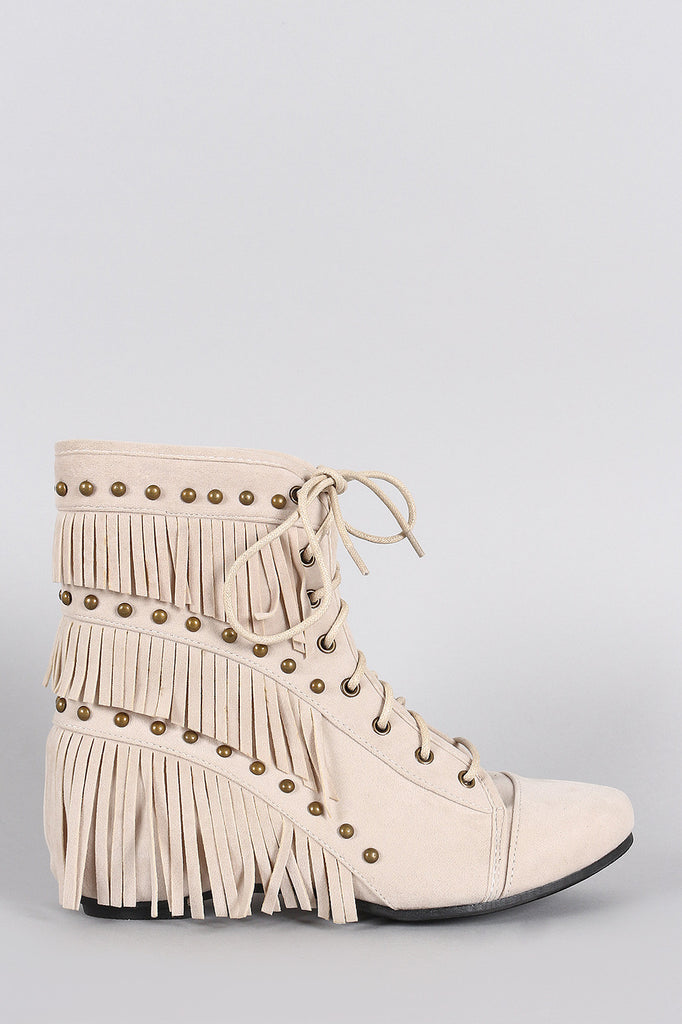 These chic fringe detail, studded accents, round toe, and hidden wedge heel. Finished with cushioned insole, soft interior lining, and lace up closure.