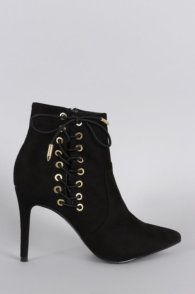 These pointy toe and stiletto heel silhouette. Designed with corseting lace up outer sides, featuring inner side adjustable zippers.