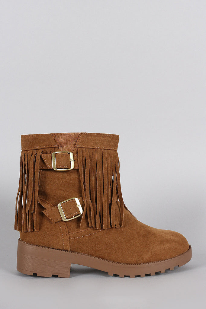 These fashionable fringe detail at ankle, decorative side buckles accent, and low block heel. Finished with cushioned insole, smooth interior lining, and side zipper closure for easy on/off.