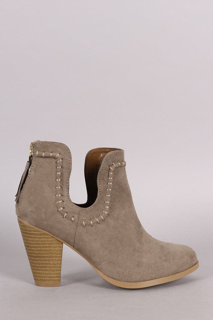 These western ankle boots feature an almond toe, notched shaft with stitched accents, and chunky stacked heel. Finished with cushioned insole and convenient back-zip closure.