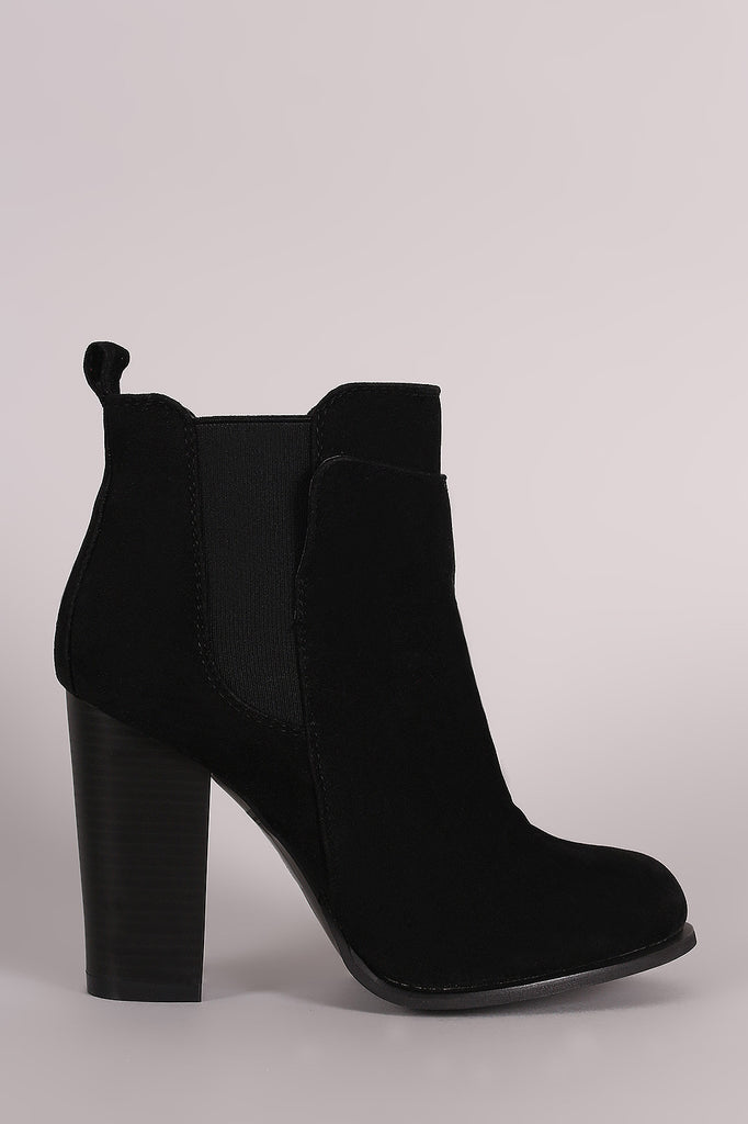 These stylish ankle boots feature a vegan suede upper with an elastic gore side panels, round toe silhouette, pull-on tab with stud accent, and chunky stacked heel. Finished with cushioned insole and smooth lining.