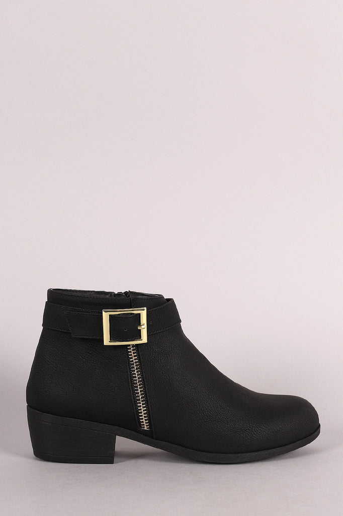 These simply chic booties feature a vegan leather upper, almond toe silhouette, buckle and strap, faux side zipper detail and low stacked heel. Zipper for easy on/off.