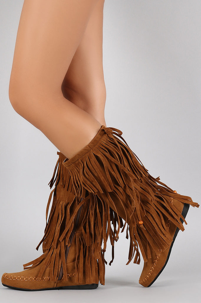 This fringe around the shaft; featuring, a mid-way inner side zipper for on-off wear. Finished with a bow at the back with a beaded end. Lightly padded lining.