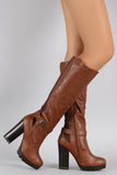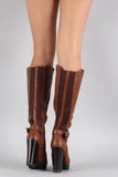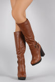 These platform and stacked heel; featuring an inner side zipper for on-off wear. Designed with elastic gores for an eye catching custom fit and an adjustable buckle. Slouchy shaft with light faux fur lining.