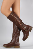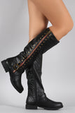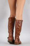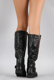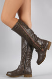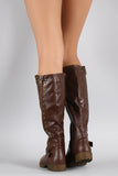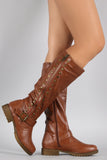 These boots feature a round toe silhouette, studded zipper trims on shaft, decorative buckle strap detail, and low block heel. Finished with cushioned insole, soft faux fur interior lining, and full-length side zipper closure for easy on/off.