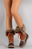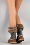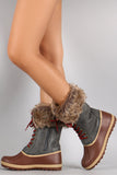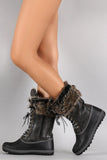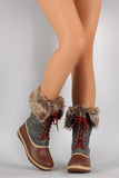 These faux fur cuff and interior lining, faux suede shaft, and water resistant PVC upper with ridges and faux stitching detail. To add to the rugged look, these boots feature two-tone round laces, bronze-tone hexagon grommets, and tread sole. Finished with a round toe, flat heel, and side zipper for easy on/off.