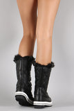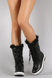 These stylish faux fur cuff, quilted shaft design, round to silhouette, and low heel. Finished with cushioned insole, faux shearling interior lining, and lace up closure.
