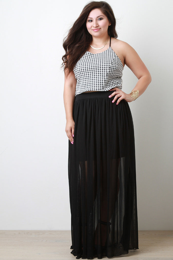 This plus size goddess maxi skirt features a mini skirt with a chiffon maxi skirt overlay. Finished with a wide elasticized waistband. Accessories sold separately. 93% Polyester. 7% Spandex.