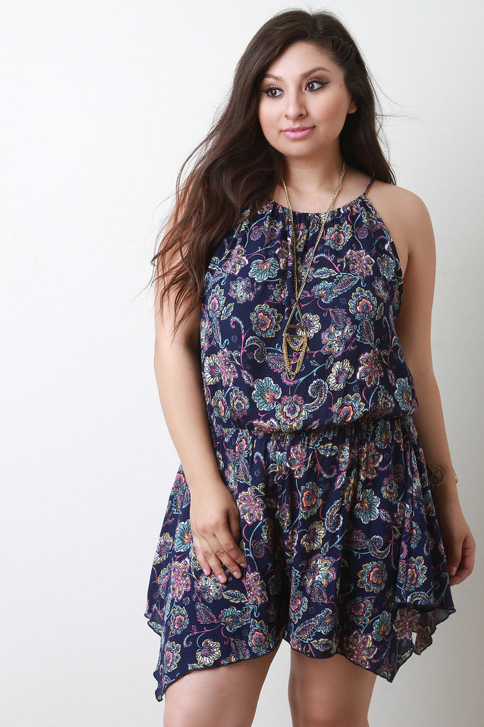 This plus size romper features a light weight woven fabrication, paisley style floral print, self tie spaghetti straps, key hole back, elastic waist, flowey loose handkerchief hem short bottom. Accessories sold separately. Made in U.S.A. 100% Rayon.