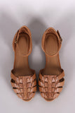 A vegan leather d'Orsay flat featuring a woven front, peep toe, and adjustable ankle strap. Finished with a lightly padded insole.