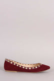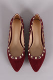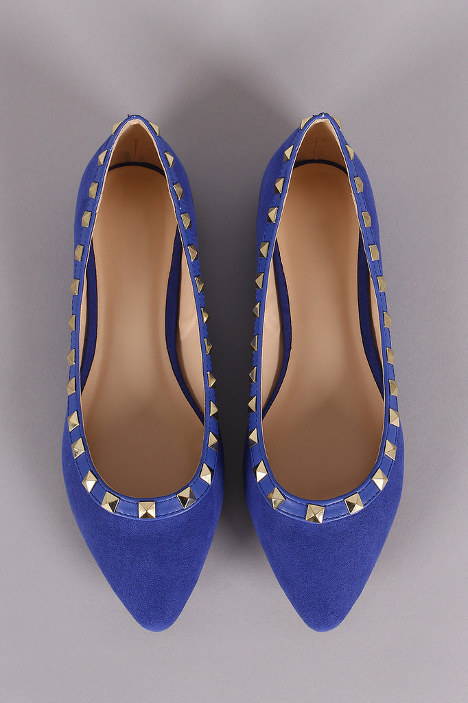 This ultra chic pointy toe silhouette, scooped vamp, contrasting vegan leather trim with pyramid stud embellishment along the edge, and lightly padded insole for comfort.