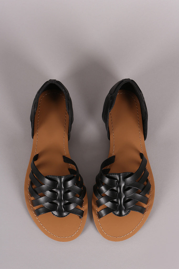 This breezy flat features an open toe silhouette, strappy woven design upper, and easy slip-on construction.