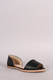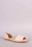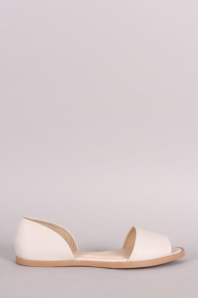 This stylish flat features a peep toe silhouette, open shanks, lightly padded insole, and easy slip on construction.
