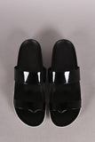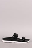 This flat sandal features double band with metallic finish, open toe silhoutte, lug sole, and easy slip on construction.
