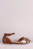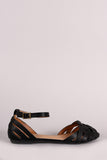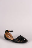 These flats feature a woven overlapping strappy vamp, peep toe silhouette, and ankle cuff with an adjustable side buckle closure. Finished with a lightly padded insole.