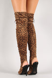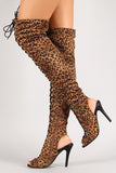 Featuring soft leopard pattern faux suede upper, corset-style lace up front, heel cut out, stiletto heel, peep toe, faux fur interior lining, lightly padded insole, and side zipper closure for easy on/off.
