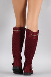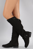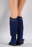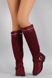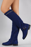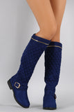 These knee high boots feature a quilted design shaft, rounded toe, zipper trims along the cuff, instep buckle strap detail, and low block heel. Finished with cushioned insole, soft faux fur interior lining, and full-length side zipper closure for easy on/off.
