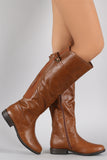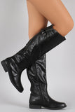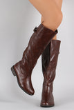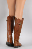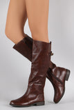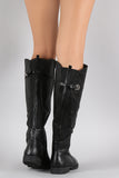 These fashion-forward  knee high boots  feature a round toe silhouette, vegan leather shaft with partial elastic gore insert, buckle strap detail, top stitching accents, and low heel. Finished with cushioned insole, soft interior lining, and full-length side zipper closure for easy on/off.