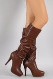 These stunning knee high boots feature an almond toe silhouette, slouchy shaft design, tribute platform, and wrapped heel. Finished with cushioned insole, soft faux fur interior lining, and partial side zipper closure for easy on/off.
