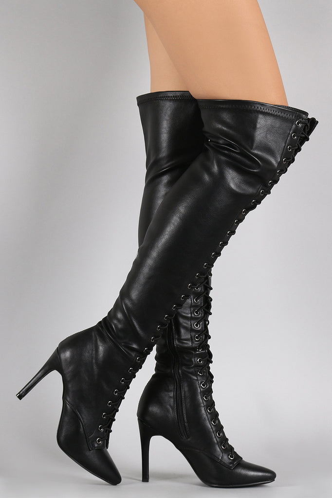These stiletto over-the-knee length. Features a mid-way inner side zipper. Light fabric lining.