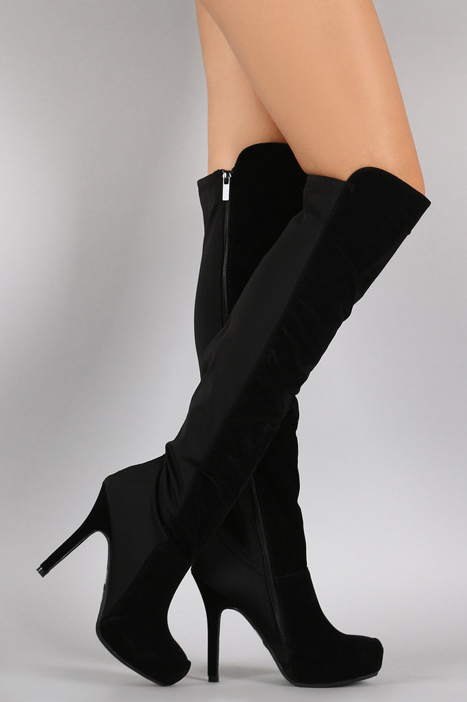 These alluring over the knee boots feature an almond toe silhouette, soft vegan suede front with stretchy Lycra fabric back panel, asymmetrical collar, hidden platform, and stiletto heel. Finished with cushioned insole, soft faux fur interior lining, and full-length side zipper closure for easy on/off.