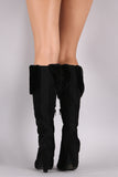 These stylish knee high boots feature a soft fold-down faux fur cuff design, partial elastic gore insert at the back, and chunky heel. Finished with cushioned insole, soft faux fur interior lining, and partial side zipper closure for easy on/off.