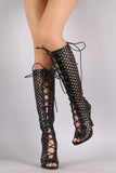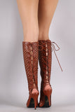 These stunning knee high boots feature a perforated design with corset-style lace up closure at front and back. Also features a peep toe silhouette, wrapped stiletto heel, and full-length side zipper closure. Finished with cushioned insole for comfort.