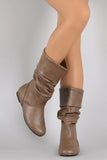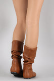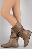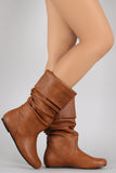 These flat boots are slouchy shaft design with fold down cuff. Mid calf length, depending on personal height. Easy pull on construction. Lightly padded lining.