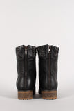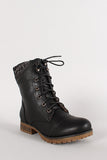 Featuring leatherette upper, sweater collar design, lace up front, stitching detail, round toe, low heel with lug sole, soft fabric interior lining, and rear zipper closure for easy on/off.