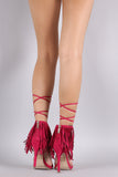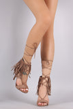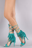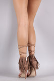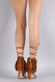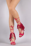 This lace up detail, and open toe silhouette. Finished with lightly padded insole, wrapped stiletto heel, and rear zipper closure for easy on/off.