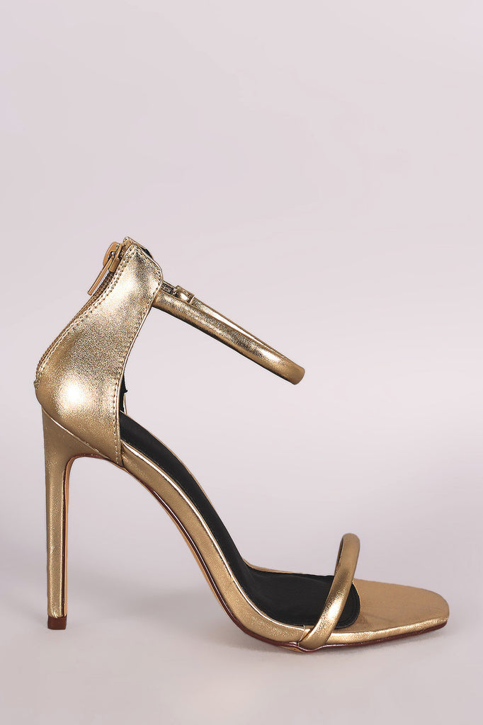 This open toe heel features a metallic vegan leather upper, single strap across vamp, ankle strap with a partial elastic insert, and wrapped stiletto heel. Finished with lightly padded insole and convenient back-zip closure.