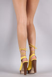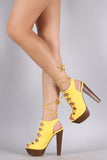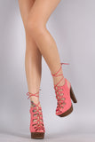 This eye-catching heel features a strappy cutout design with button detail, corset lace up closure, slingback strap, open toe silhoutte and chunky platform heel. Finished with a lightly padded insole for comfort.