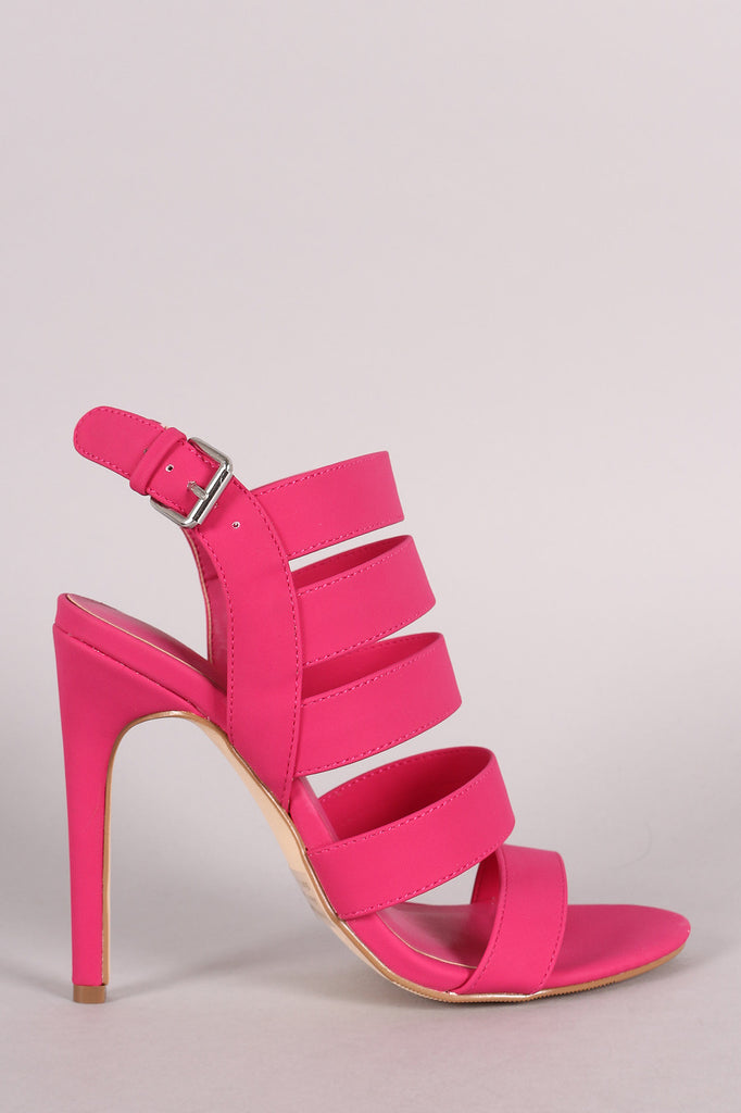 This irresistible heel features a strappy construction vamp, open toe silhouette, and wrapped stiletto heel. Finished with lightly padded insole and adjustable slingback strap with buckle fastening.