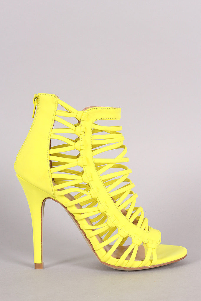 This open toe heel features a slim crisscrossing straps with knotted detail, wrapped stiletto heel, lightly padded insole, and convenient back-zip closure.