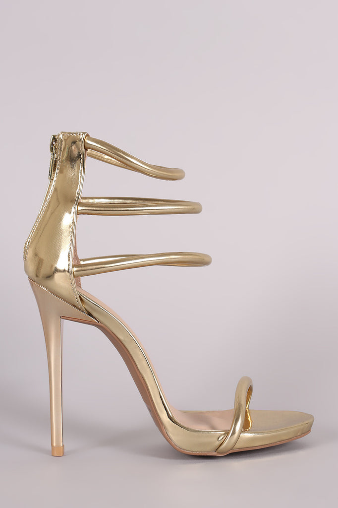 This eye catching heel features an open toe silhouette, triple ankle straps, wrapped stiletto heel, and rear zip-up closure. Finished with a lightly padded insole.