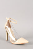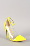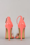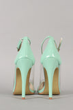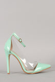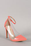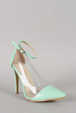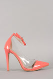 Featuring pointy toe, glossy patent upper with lucite side panels, and stiletto heel. Finished with lightly padded insole and adjustable ankle strap with buckle closure.