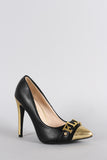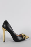 This striking pointy toe cap with gold-toned 3 dimensional FLAWLESS letter accent, contrasting wrapped stiletto heel, lightly padded insole, and easy slide style.