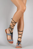 This open toe  sandal  features a lace-up design, self-tie closure, beadwork embellished center vamp connected to double woven tribal straps, and lightly padded insole for comfort.
