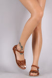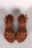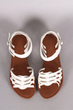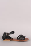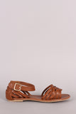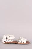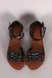 This fun sandal features an open toe silhouette, strappy woven design upper, lightly padded insole, and adjustable ankle strap with buckle fastening.