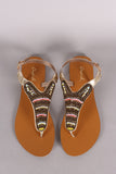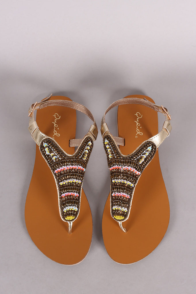 This  flat sandal  features a t-strap thong vamp, beadwork embellishment, adjustable buckle slingback, and a smooth seamless insole finish.